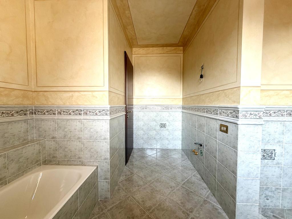 Attraverso un’elegante scala in marmo si accede alla zona notte, composta da due ampie camere singole, entrambe con balcone. La camera matrimoniale, di generose dimensioni, dispone anch’essa di balcone con affaccio sul verde, offrendo un’atmosfera riservata e rilassante. Completa il piano un ampio bagno finestrato con vasca.